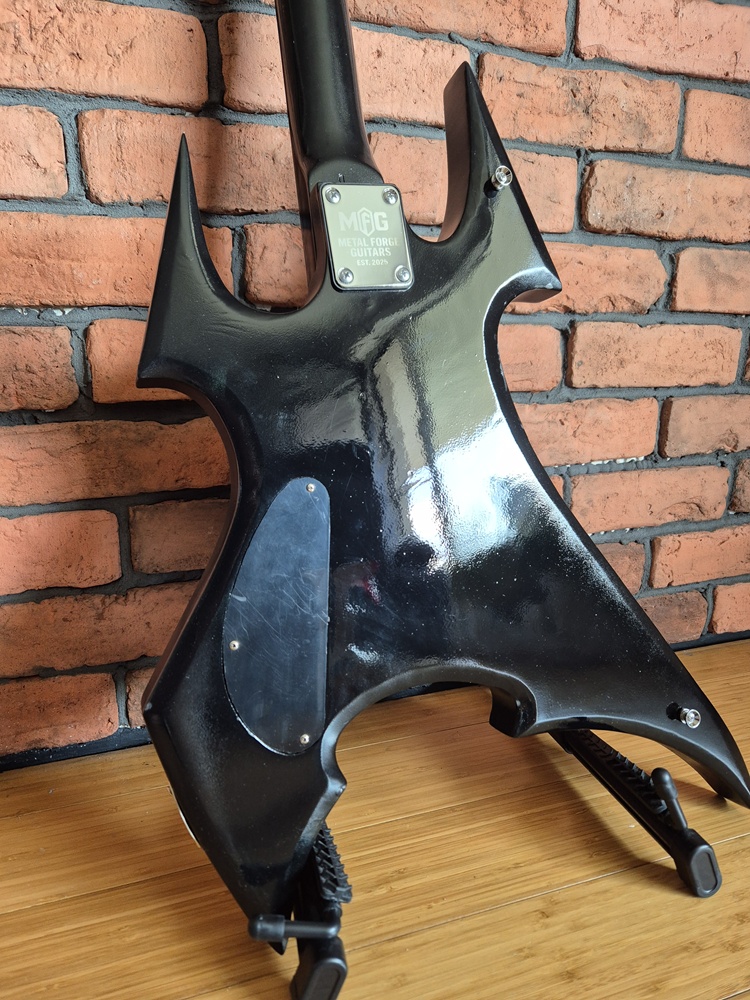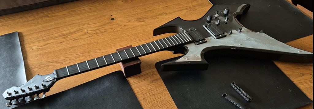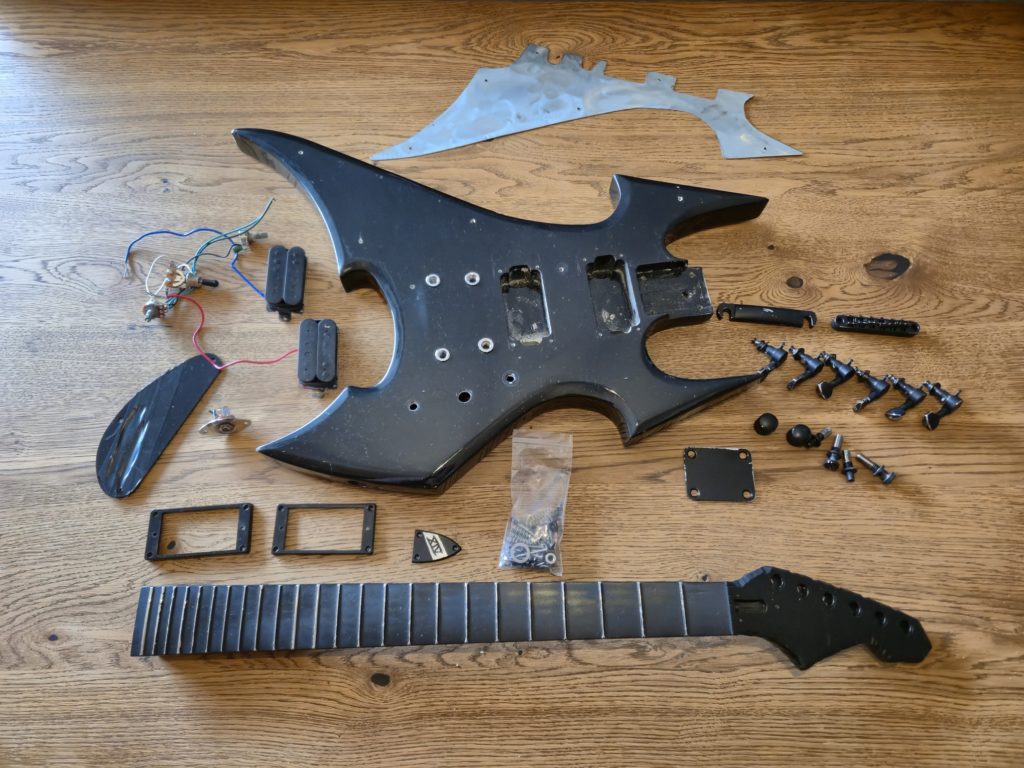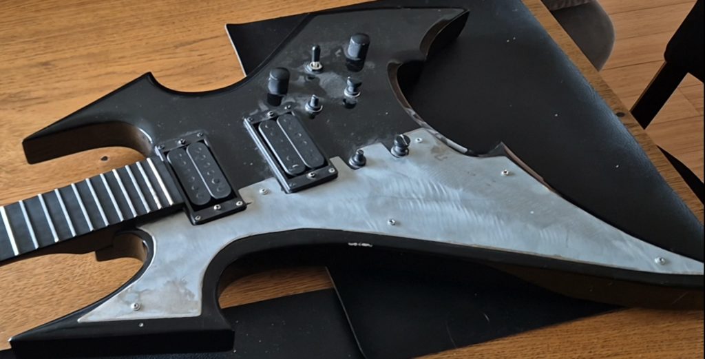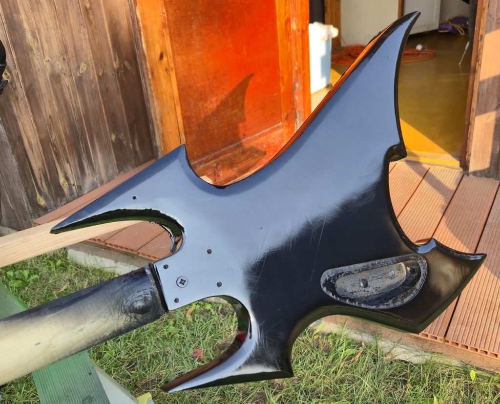 Pewne doświadczenia z projektu ukulele juz miałem. Postanowiłem więc rozejrzeć się za jakims elektrykiem. W głowie wizualizowałem sobie kształt typu les paul. Wybrałem i zamówiłem w sklepie thomann ten produkt https://www.thomann.pl/harley_benton_electric_guitar_kit_lpstyle.htm, ale w tym czasie Harley Benton ogłosił konkurs na jak najlepiej zrobiony projekt z ich zestawów DIY. Brak towaru w magazynie, z dostępność zamiast się skracać to się wydłużała. Poddałem się jak kazali czekać 9-12 tygodni. Zaczałem zatem szukać używanych gitar w okolicy i w rozsądnej cenie. W krótkim czasie trafiłem na ogłoszenie o używanej gitarze „do grania black metalu”. Miał być „full custom”. Kształt? A’la warlock.