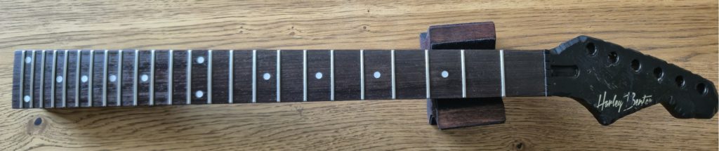Pierwszymi krokami było porozkręcanie wszystkiego, wyczyszczenie elementów chromowanych, usuniecie farby z gryfu. Przy okazji zdejmowania farby ujawniło się logo producenta tej „full custom” gitary – Harley Benton.