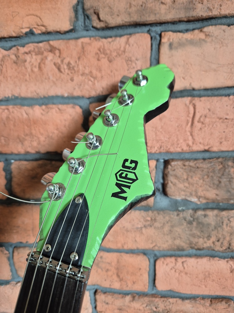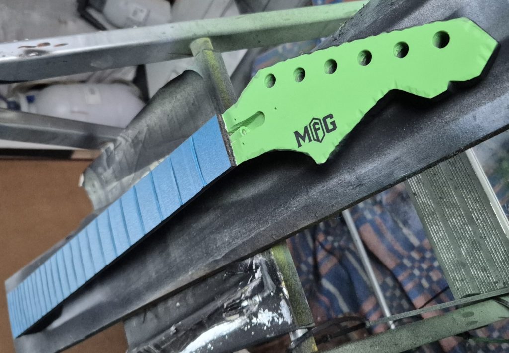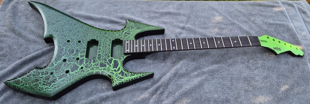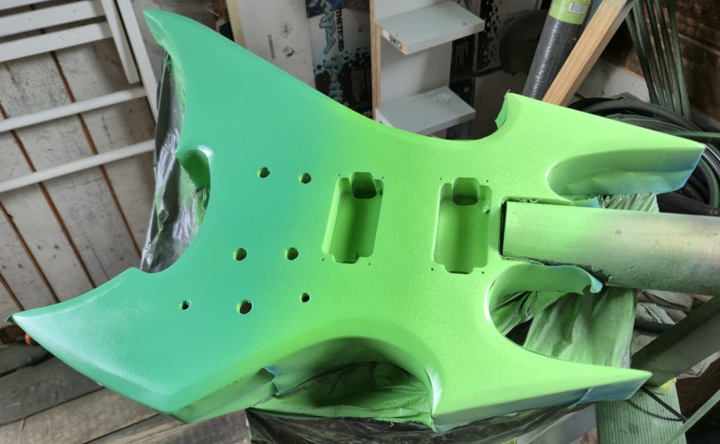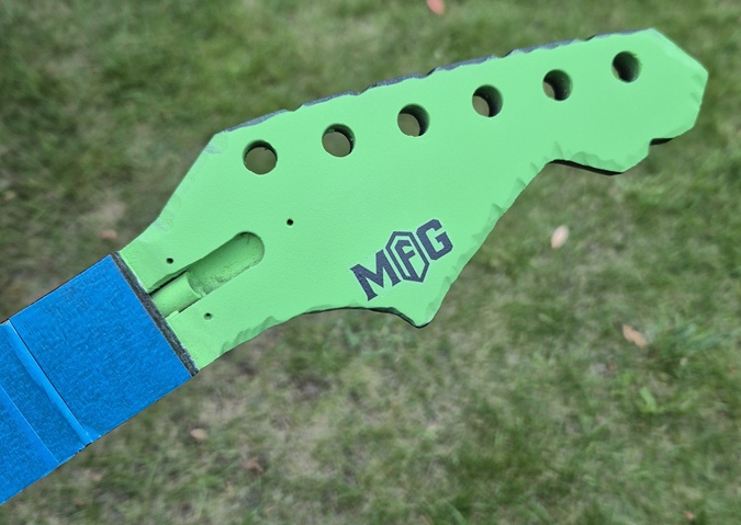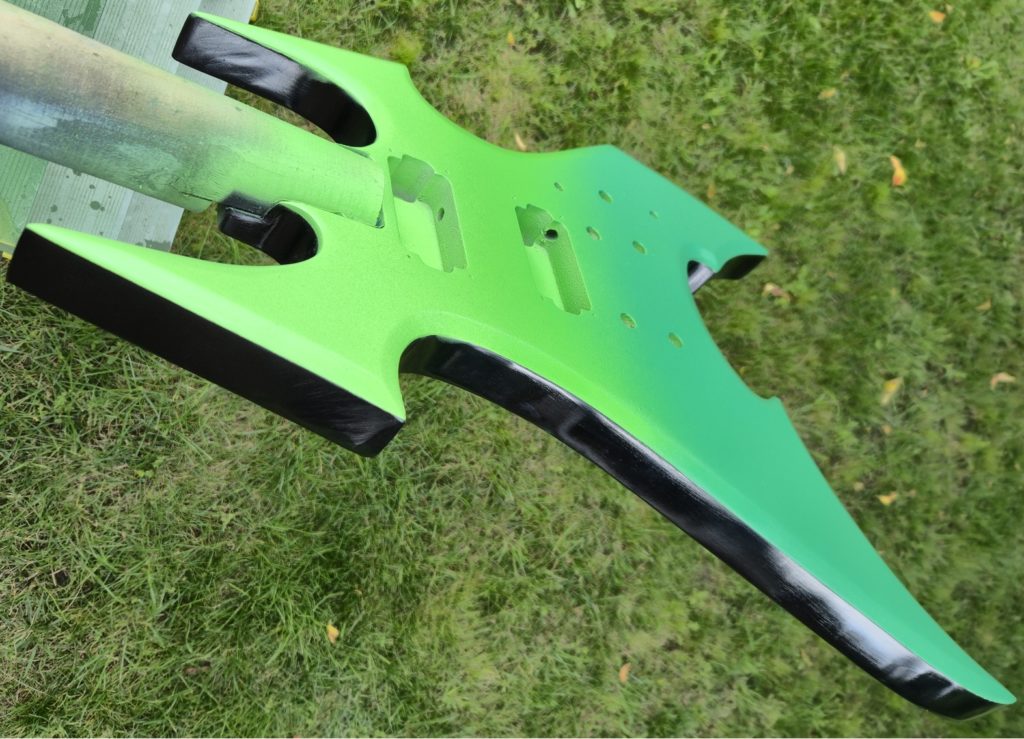 Do pomalowania został gryf. Główka przemalowana na zielono z naniesionym logo, reszta pomalowana na czarno i zabezpieczona lakierem z utwardzaczem.