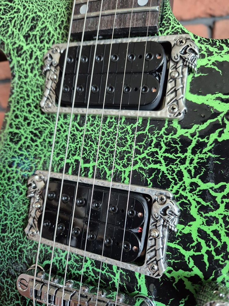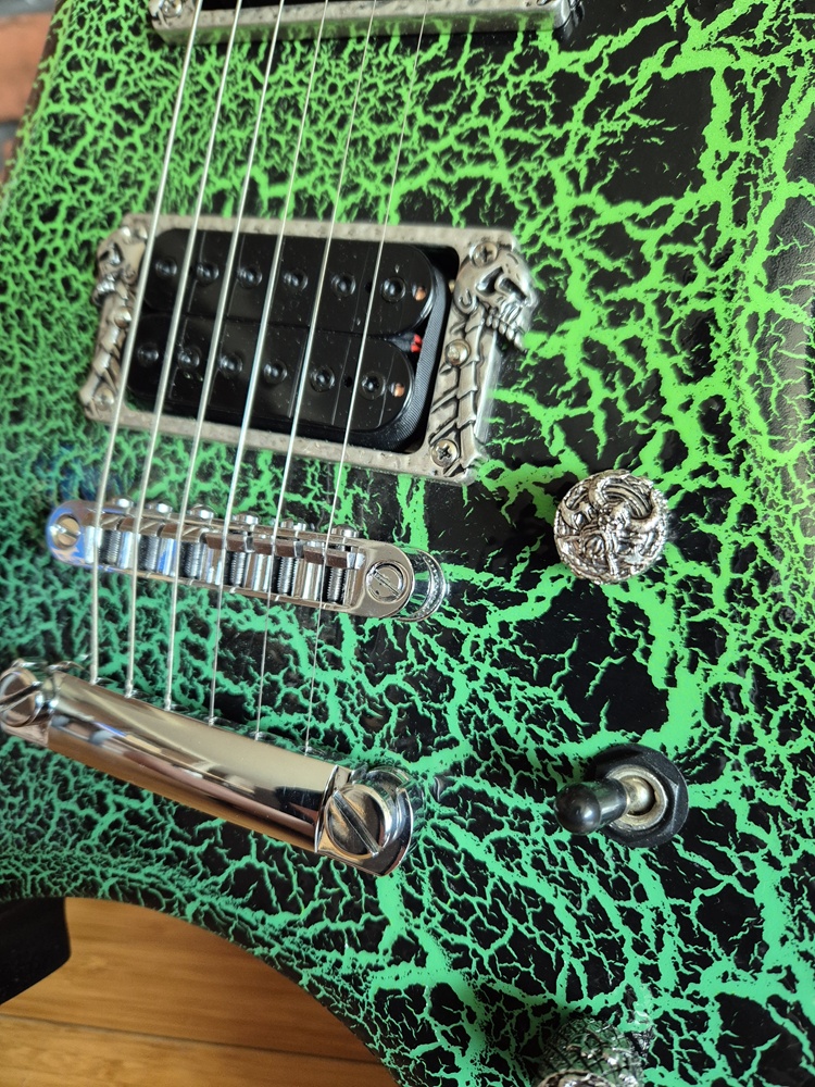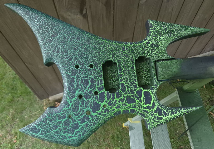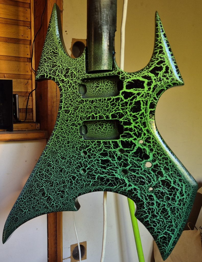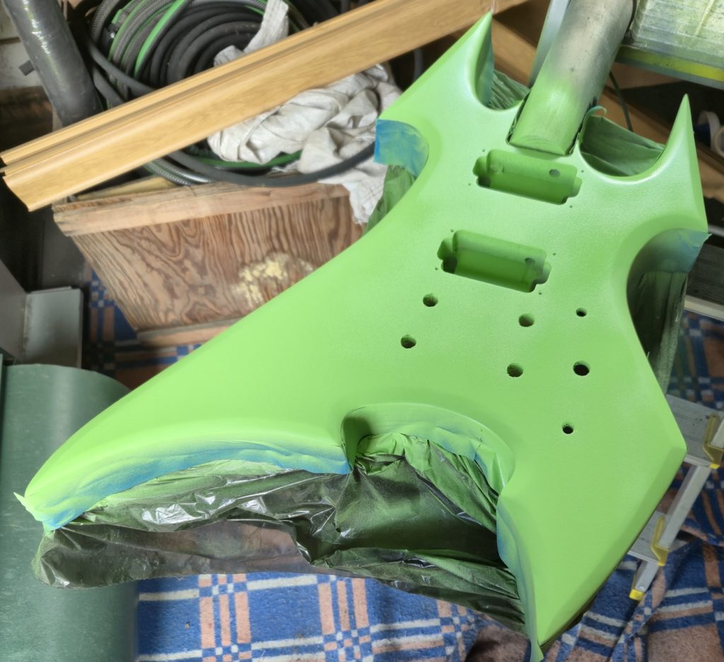 Do pomalowania został gryf. Główka przemalowana na zielono z naniesionym logo, reszta pomalowana na czarno i zabezpieczona lakierem z utwardzaczem.
