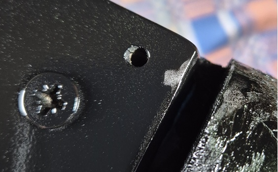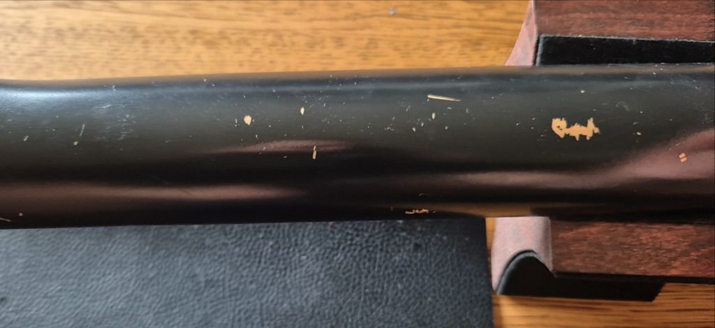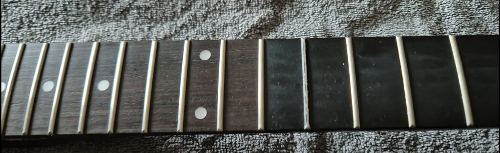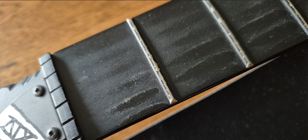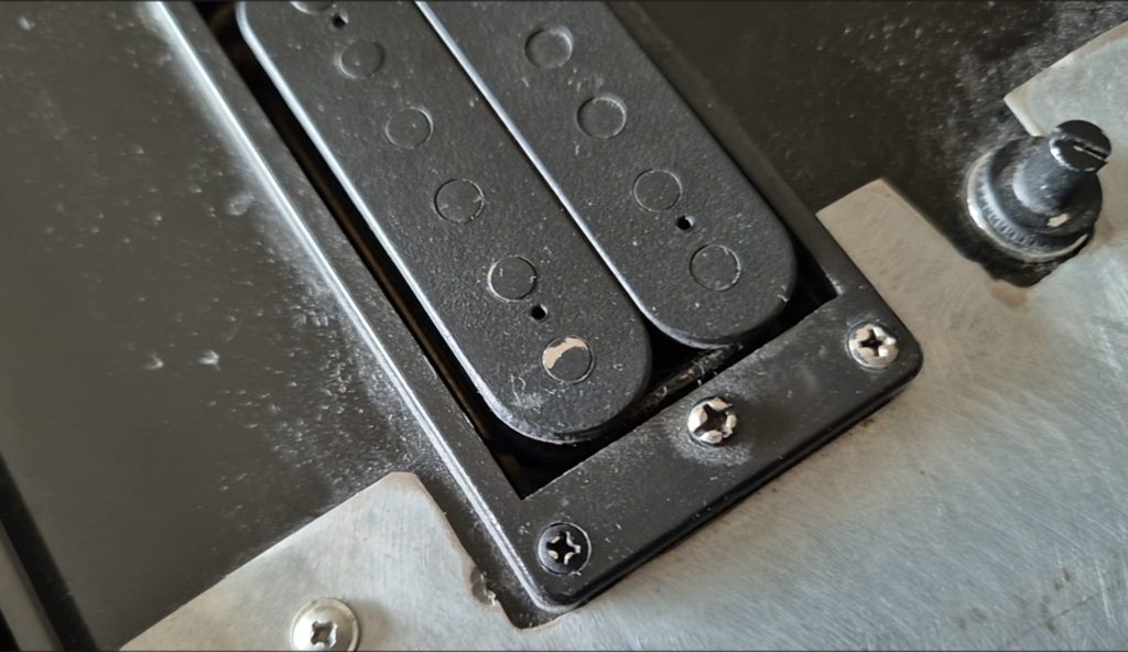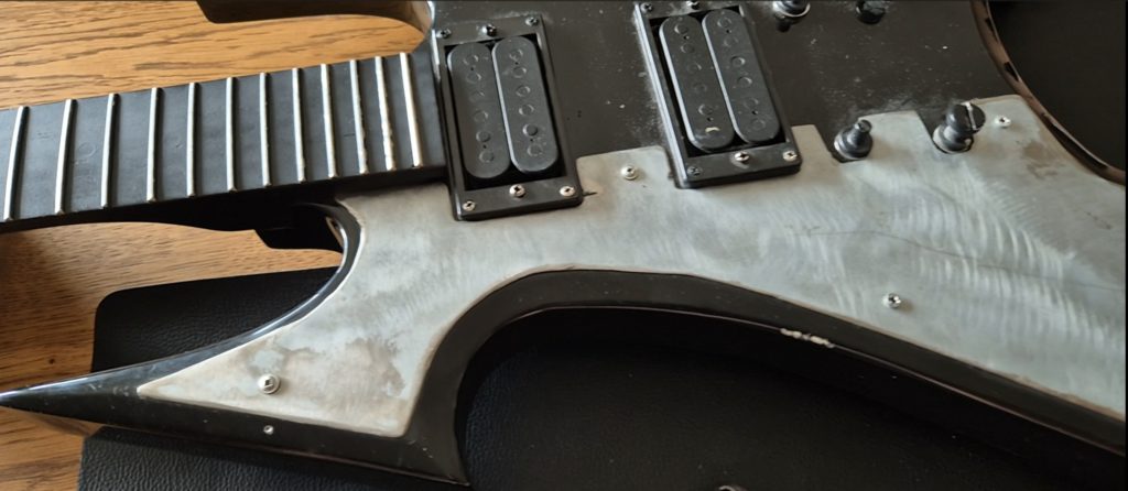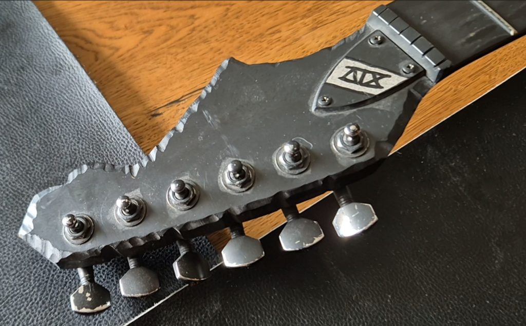 Gitara mocno po przejściach. Główka potraktowana szlifierką kątową, siodełko rozpiłowane, wycięty amatorsko fragment metalu, który został przykręcony do korpusu śrubami każda z innej parafii. I wszystkie elementy, które były chromowane, główka, gryf(!) zostały pomalowane farbą akrylowa w sprayu.