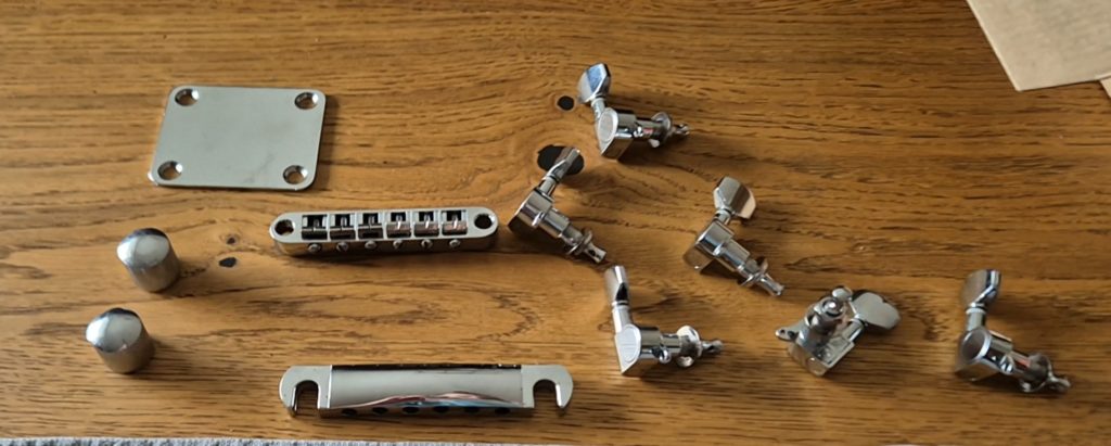 Pora na zabranie sprzętu do domu i zmontowanie wszystkiego do kupy. Do gitary dokupiłem nowe pickup’y, ramki do pickup’ów, gałki potencjometrów, siodełko, uchwyty do paska, płytke do mocowania gryfu z logo MFG, zaślepka tylną, struny.