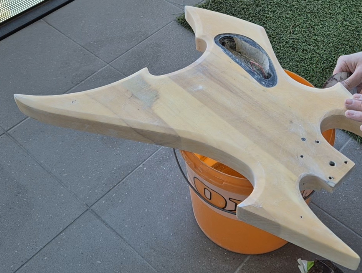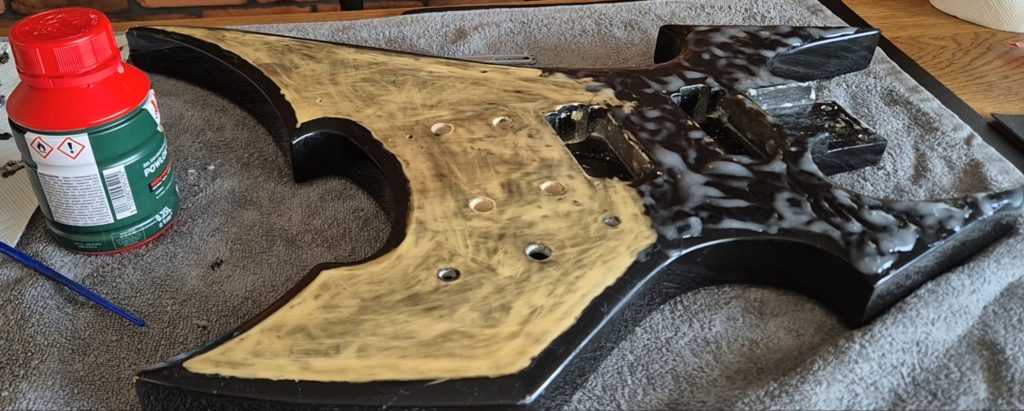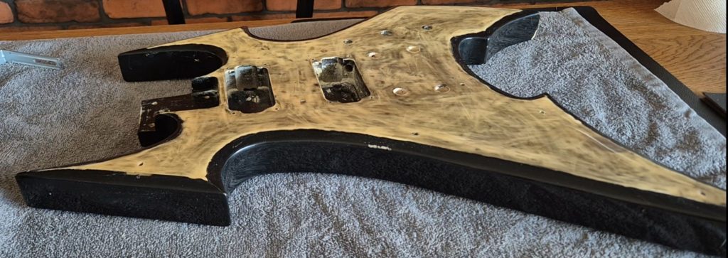 Do usuwania farby użyłem produktu: 3v3 – Środek Do Usuwania Starych Powłok. Myślałem, że to będzie starzał w dziesiątkę, ale okazało się, że do usuwania tego typu lakieru lepsza jest… szlifierka. O ile gryf i elementy metalowe całkiem przyjemnie się czyściło, to top gitary to były godziny ciężkiej pracy. Później i tak zdecydowałem się całość usunac mechanicznie. Zdecydowana oszczedność czasu.
