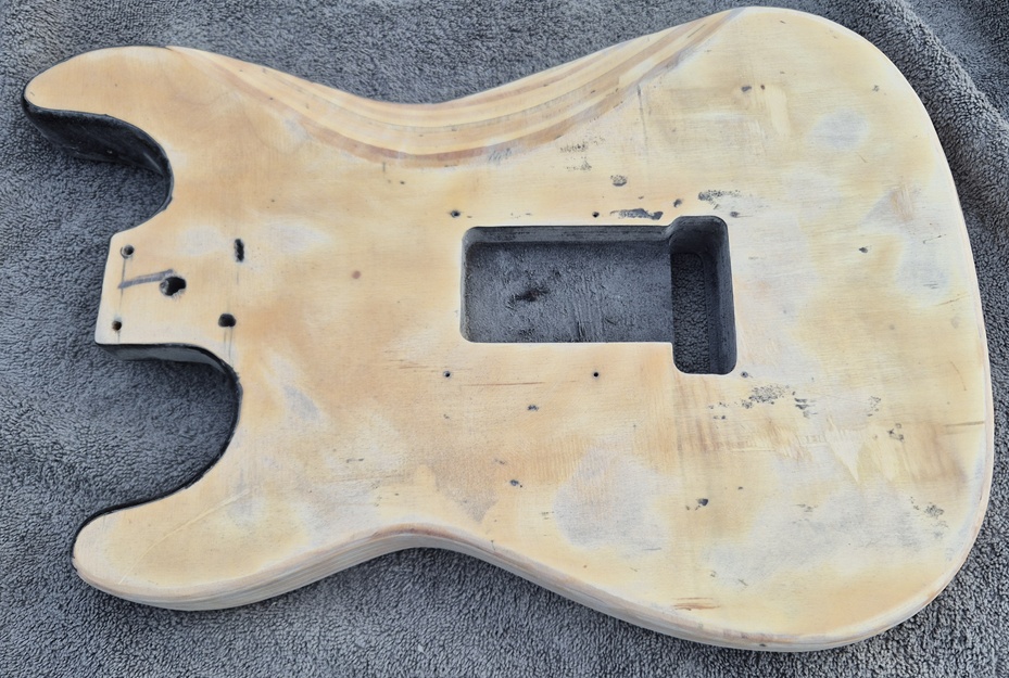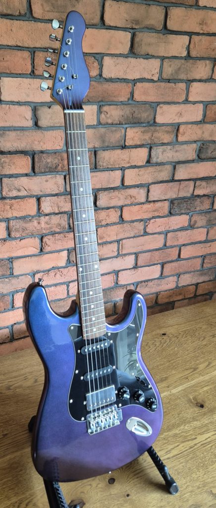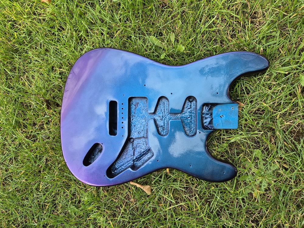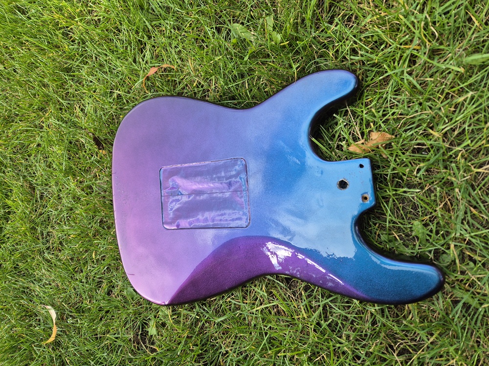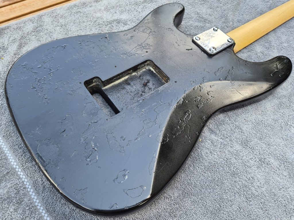 Na początku myślałem o połączeniu żótego korpusu z czarnym pickguardem. Ale szukałem dalej inspiracji i natrafiłem na ciekawy efekt lakieru typu kameleon. Mamy kolejny rok ze sztuczna inteligencją, więc poprosiłem ją o pomoc w wygenerowaniu wizualizacji gitary w takim kolorze. Efekty pokażę na końcu. Tym razem na warsztat trafił stratocaster z olx. Gitara wyposażona w korpus, gryf, klucze i coś co miało przypominać pickguard. Sprzedający zachwalał porządny materiał korpusu, dobry stan gryfu. Był niesłychanie dumny, że dla poprzedniego właściciela „postarzył” gitarę. Co wiązało się po prostu ze zniszczeniem warstwy lakieru na korpusie. Pozostawiam to do oceny każdego z osobna. Wygłądało to tak: