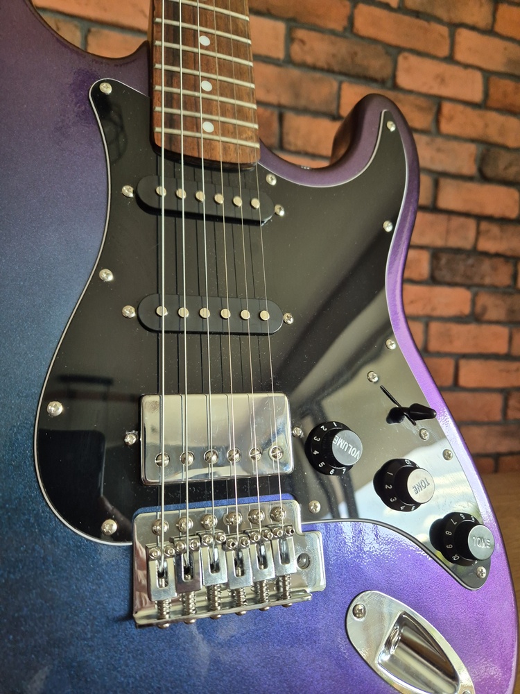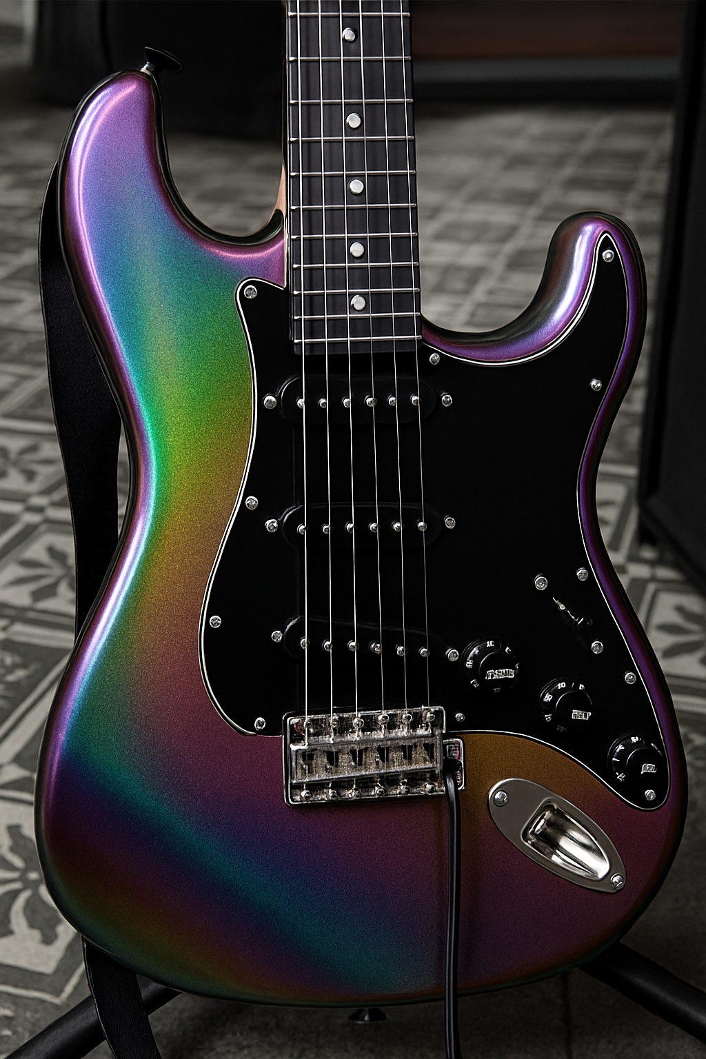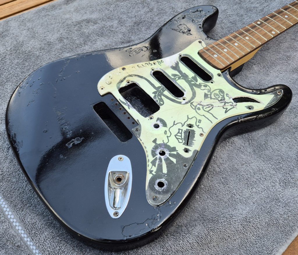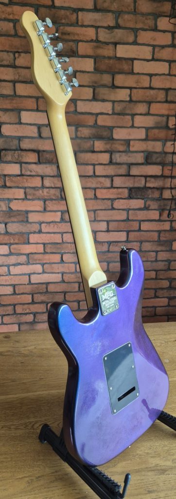 Na początku myślałem o połączeniu żótego korpusu z czarnym pickguardem. Ale szukałem dalej inspiracji i natrafiłem na ciekawy efekt lakieru typu kameleon. Mamy kolejny rok ze sztuczna inteligencją, więc poprosiłem ją o pomoc w wygenerowaniu wizualizacji gitary w takim kolorze. Efekty pokażę na końcu. Tym razem na warsztat trafił stratocaster z olx. Gitara wyposażona w korpus, gryf, klucze i coś co miało przypominać pickguard. Sprzedający zachwalał porządny materiał korpusu, dobry stan gryfu. Był niesłychanie dumny, że dla poprzedniego właściciela „postarzył” gitarę. Co wiązało się po prostu ze zniszczeniem warstwy lakieru na korpusie. Pozostawiam to do oceny każdego z osobna. Wygłądało to tak: