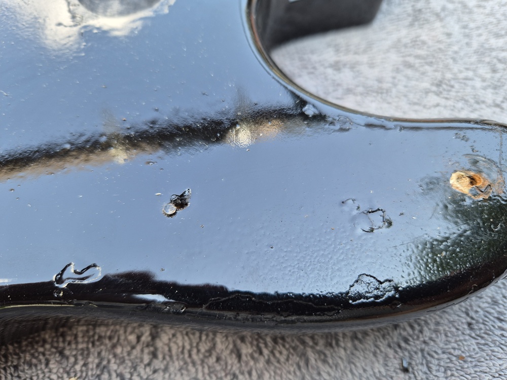 Przyszedł czas na odtłuszczenie i pomalowanie podkładem. Zgodnie z instrukcją na lakierze podkład powinien być czarny. Nałożyłem 3 warstwy podkładu. Na korpusie pozostały ślady, ubytki. Miałem nadzieje, że kolorowy lakier to wypełni. Jak się potem okazało, ani lakier kolorowy, ani bezbarwny nie usunął tej wady.