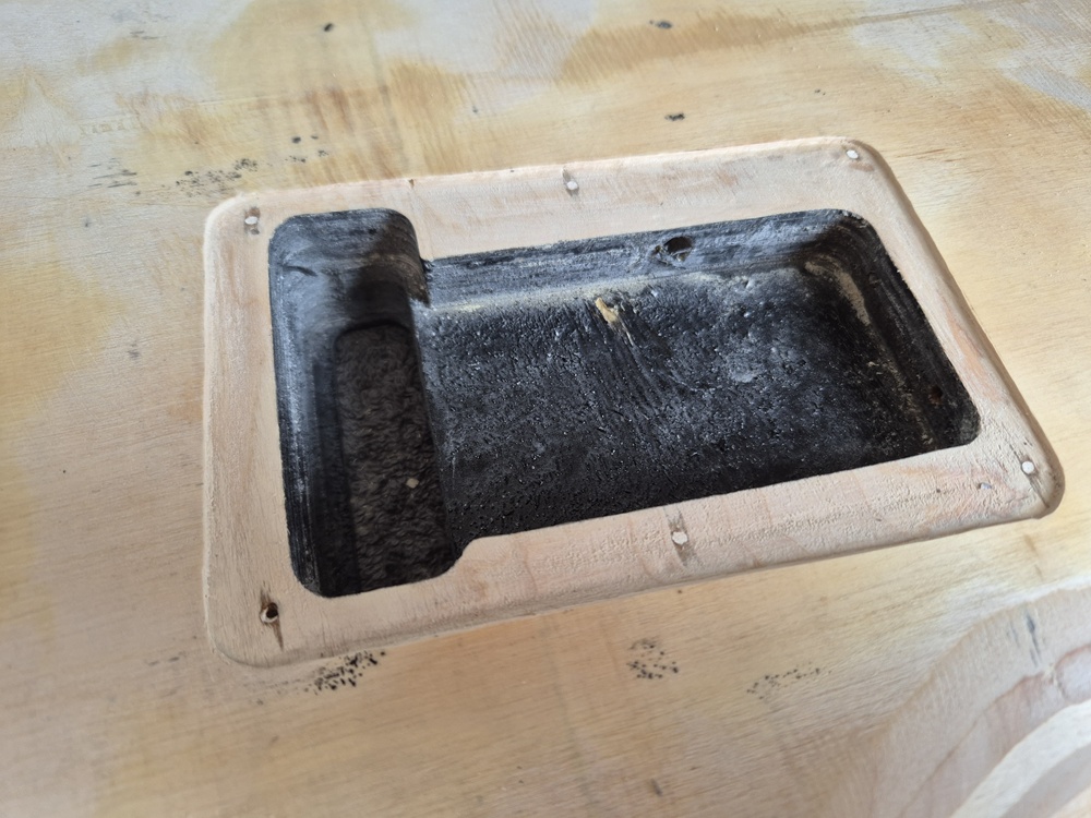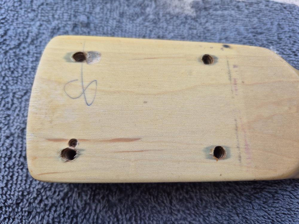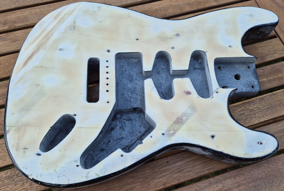 W tym momencie zorientowałem się, że osłonka na tremolo i sprężyny powinna być przykręcona bezpośrednio do korpusu. Nie podobało mi się to i przy użyciu frezów i papieru ściernego w multiszlifierce wykonałem wpust na osłonkę.