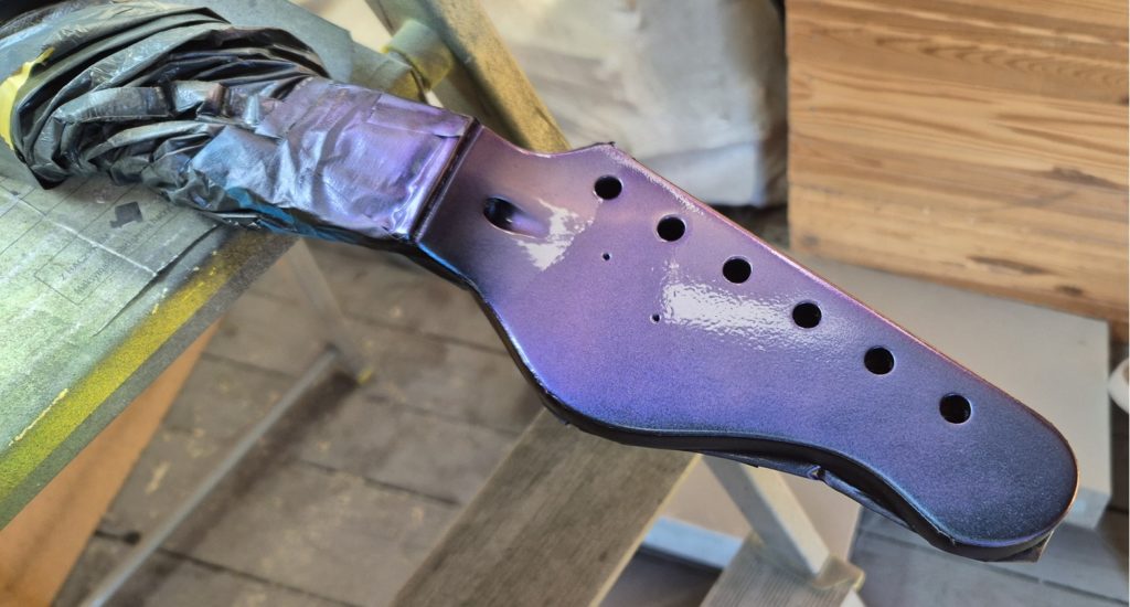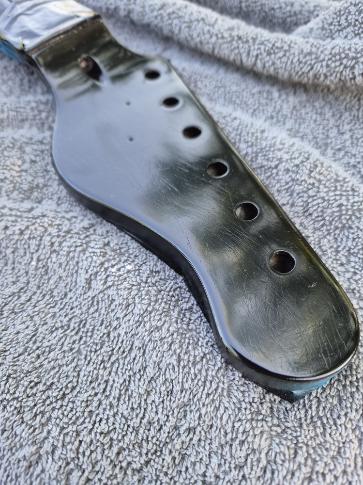 Główka gryfu mimo pozostawionych po podkładzie rys wyszła finalnie bardzo dobrze i nie wymagała dalszych działań. Pokryłem ją 3 warstwami lakieru z utwardzaczem i pozostawiłem do wyschniecia.
