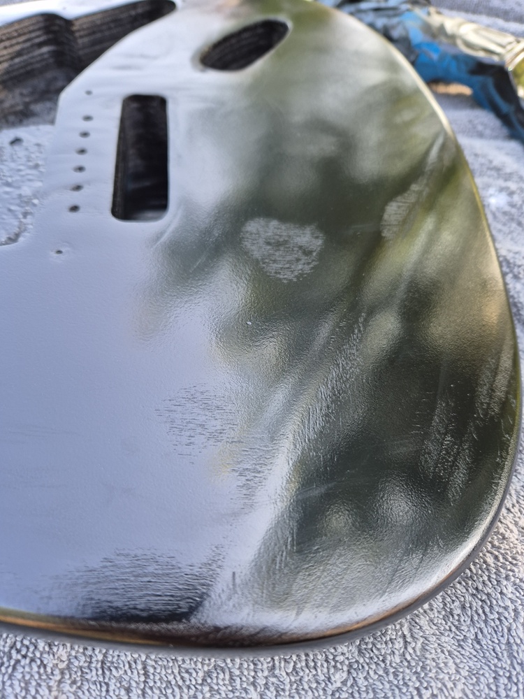 Postanowiłem, że zmodyfikuję cały korpus i frontową stronę główki gryfu. Chciałem, żeby to była najdokładniej wyszlifowana gitara ze wszystkich trzech. Użyłem papierów o gradacji od 150 do 2500. Z efektu byłem bardzo zadowolony pod palcami nie czuć było absolutnie żadnych nierówności.