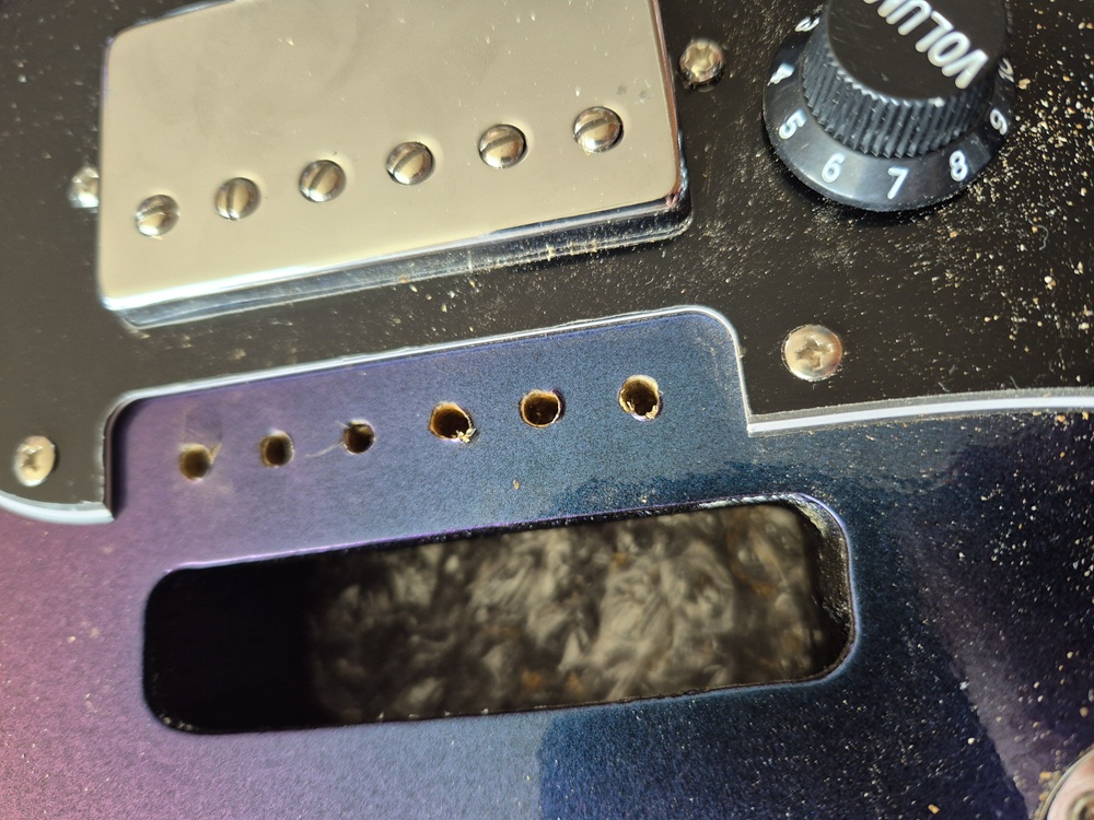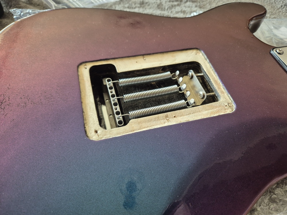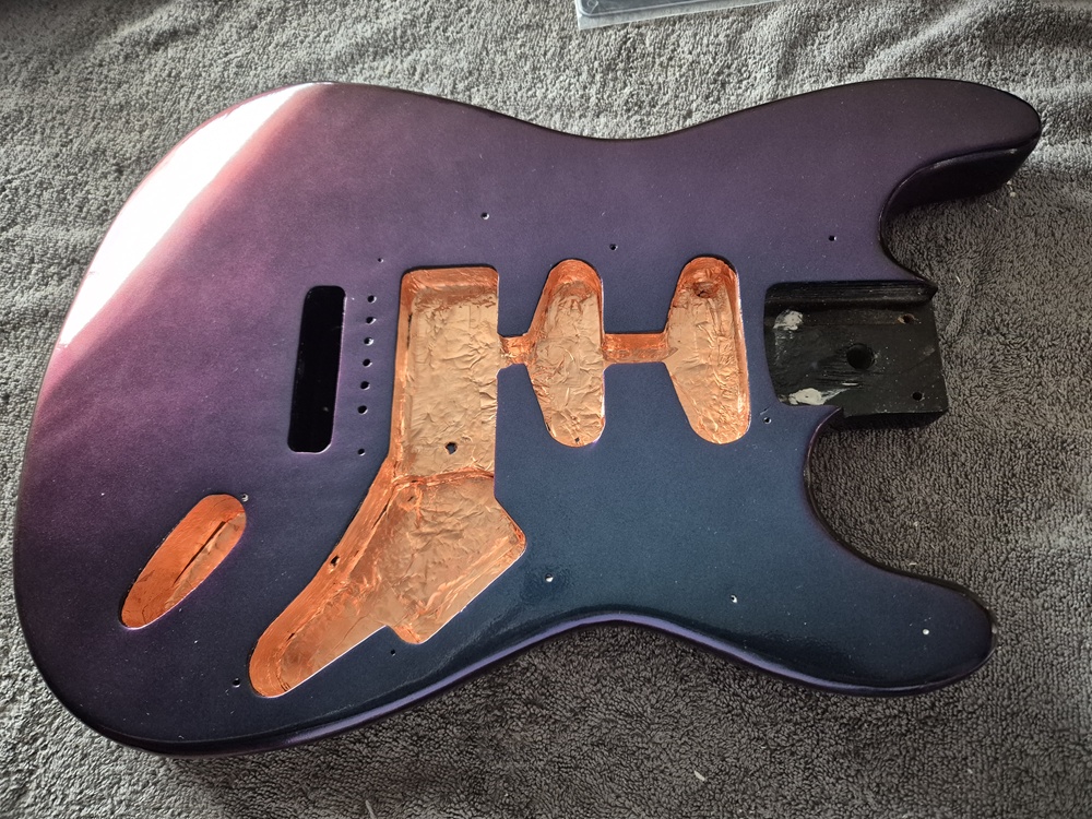Już wcześniej zamówiłem wszystkie brakujące i potrzebne części do gitary. Pora była na złożenie całości w domu i pokazanie efektu końcowego. Podobnie jak w projekcie drugim tak i tutaj wnętrze zostało wyekranowane taśma miedzianą. Przy montażu natrafiłem jeszcze na artefakty „postarzania” i znalazłem kilka pozostawionych urwanych śrub (przy sprężynach równoważących tremolo oraz mocujących tremolo do korpusu.